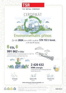 Díky tomu, že v TSR dáváme druhou šanci dosloužilým kovovým výrobkům, snižujeme vznik emisí a šetříme energii potřebnou pro výrobu kovů z nerostných surovin.